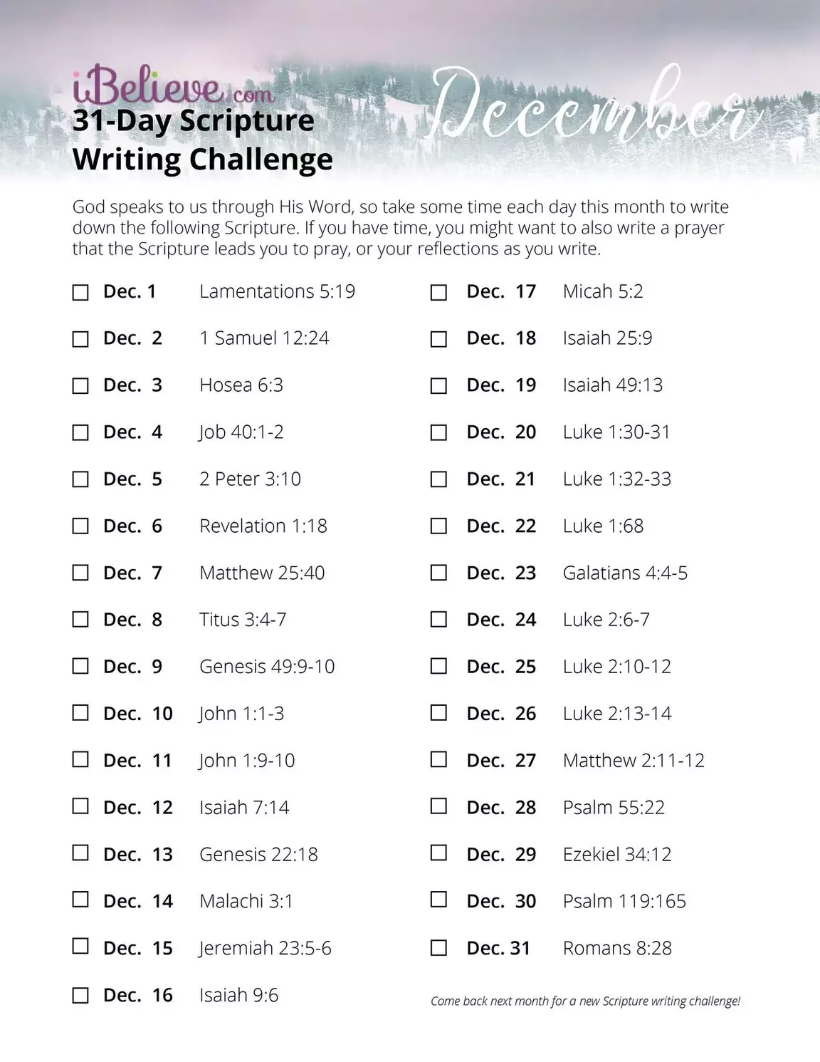 December Scripture Writing Guide Updated Nov 30, 2017 DOWNLOAD NOW Share this Originally published Thursday, 30 November 2017.