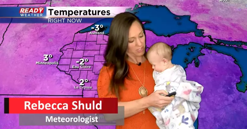 Rebecca Shuld from Milwaukee, Wisconsin appears in the weather forecast with her adorable baby girl. Rebecca makes small jokes about her sweet daughter Fionna having bedhead and getting up from her naps. Rebecca records from home with the baby. She is in her messy basement with a green screen set up. She says, “This is real life folks.”