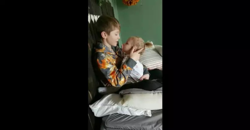 Oh my goodness, those are big brother goals right there! He is so gentle with her as he holds her close and delicately touches her hair. And the way that his little sister looks up at him while he is singing will make your heart just melt!